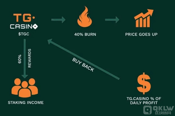 如前所述,平臺游戲和投注的部分利潤將分配給Tokens持有者,這激勵更多投資者將Tokens鎖定用于質押,因為他們現在可以從賭場運營的利潤中獲得額外收入。 60% 的利潤以Ethereum的形式回報給質押Tokens持有者,其余的 40% 將用于Tokens回購和銷毀。這是 TG Casino 自我投資的策略,透過減少 $TGC 的供應來創造通貨緊縮效應,從而隨著營運利潤的增加提升Tokens價值。
