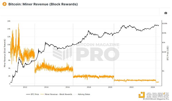 減半事件顯著減少了礦工的BTC收入,并且歷史上推動(dòng)了價(jià)格上漲。然而,隨著區(qū)塊獎(jiǎng)勵(lì)隨時(shí)間減少,減半對(duì)Bitcoin價(jià)格的影響可能會(huì)減弱。例如,從每個(gè)區(qū)塊6.25BTC減少到3.125BTC的變化相當(dāng)顯著,但未來的減半將看到更小的減少,可能會(huì)削弱它們對(duì)市場(chǎng)的影響。