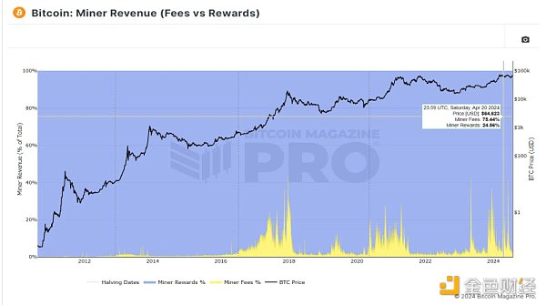 隨著礦工從交易手續(xù)費(fèi)中獲得的收入增加,減半事件在塑造礦工激勵(lì)機(jī)制中的重要性可能會(huì)降低。如果交易手續(xù)費(fèi)占礦工收入的比重越來越大(如下圖中黃色陰影區(qū)域所示),礦工可能會(huì)對(duì)區(qū)塊獎(jiǎng)勵(lì)減少50%的影響不那么擔(dān)憂(區(qū)塊獎(jiǎng)勵(lì)收入在下圖中以藍(lán)色陰影區(qū)域表示)。這一轉(zhuǎn)變表明,減半事件對(duì)礦工行為以及Bitcoin價(jià)格的主導(dǎo)影響可能會(huì)隨著時(shí)間的推移而減弱。