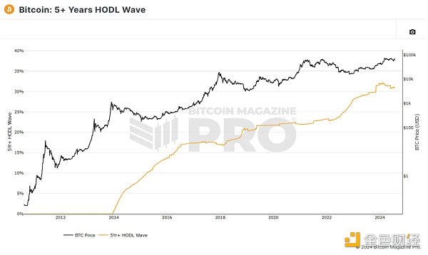 長期持有Bitcoin的趨勢(shì)日益增加,這是可能減弱Bitcoin價(jià)格周期性波動(dòng)的另一個(gè)因素。數(shù)據(jù)顯示,超過30%的供應(yīng)量在過去5年內(nèi)沒有移動(dòng)過,這一比例在宏觀層面上可能會(huì)繼續(xù)迅速上升,如下圖所示;橙色線表示至少半個(gè)世紀(jì)沒有變動(dòng)的Bitcoin的百分比。無論這些Bitcoin是丟失的還是被長期投資者持有,這種行為減少了流通供應(yīng)量,現(xiàn)已超過減半事件帶來的新供應(yīng)減少的影響。