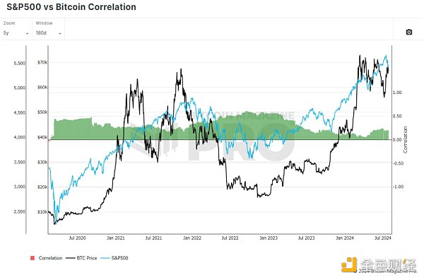 鑒于Bitcoin自身基本因素的影響可能會(huì)減弱,新市場(chǎng)參與者的影響增加,以及Bitcoin與傳統(tǒng)資產(chǎn)和指數(shù)(如標(biāo)普500)的歷史上強(qiáng)正相關(guān)性,Bitcoin可能會(huì)開始跟隨更傳統(tǒng)的市場(chǎng)周期,例如那些通常持續(xù)8-10年的股市周期。在下圖中,我們可以看到Bitcoin價(jià)格走勢(shì)(黑線)與標(biāo)普500價(jià)格走勢(shì)(藍(lán)線)。