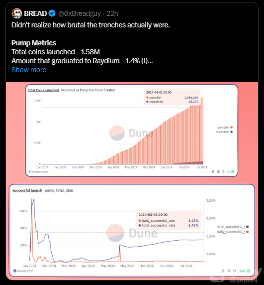 Web3開發者Bread也指出,在創建的158萬個Tokens中,只有22,300個真正進入了Raydium。這些數據揭示了Pump.fun上的絕大多數memecoin并未能走出生成階段,進入實際交易市場。