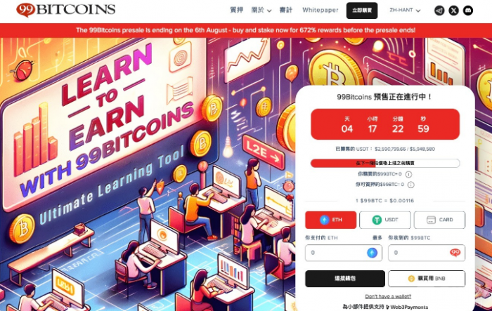 隨著Bitcoin(BTC)最新突破67,000美元,整個加密市場掀起了一股熱潮。在過去的24小時內,幾乎所有BRC-20Tokens都借勢上漲,抓住了這一波看漲的勢頭。與此同時,一些投資者開始關注99BitcoinsTokens(99BTC),認為在其預售階段結束后,可能會成為下一個爆發的Tokens。
