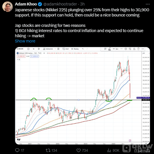 SOFA.org 的 Insights 主管 Augustine Fan 表示:“套利交易的平倉(cāng)是宏觀交易停止的征兆,我們已經(jīng)看到各種資產(chǎn)類別的大幅波動(dòng),對(duì)沖基金被迫減少頭寸以保護(hù)損益。”Fan 還補(bǔ)充道:“日本一直是美元日元多頭和日經(jīng)指數(shù)多頭頭寸的盈虧收入來(lái)源,解除這些主要來(lái)源可能表明風(fēng)險(xiǎn)情緒非常悲觀,并會(huì)降低未來(lái)的風(fēng)險(xiǎn)偏好。”