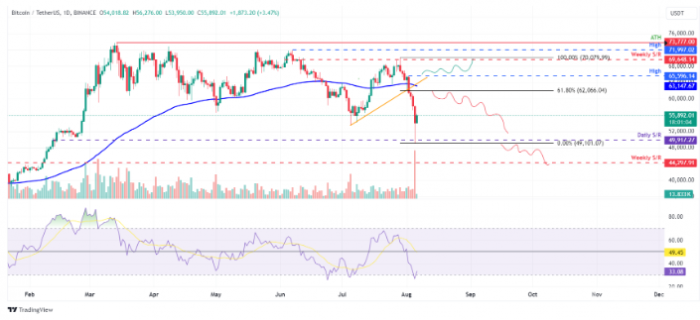 在這種情況下,Bitcoin可能會出現短期復蘇,即下跌趨勢中的暫時價格上漲,但可能會在62,066美元的斐波那契回撤位61.8%處遇到阻力(從7月29日的高點70079美元跌至周一的低點49,101美元)。該水平對應于突破的趨勢線和65,596美元的100天指數移動平均線(EMA),標志著關鍵的反轉區域。