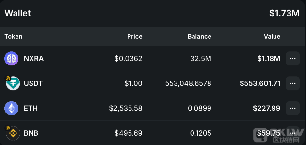 根據 Zapper 數據,攻擊者目前持有 3250 萬個 NXRA Tokens,價值約 118 萬美元,并持有 55.3 萬美元的 USDT 以及少量 ETH 和 BNB。