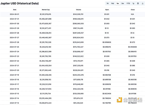 FDV:JUP 現幣價為 0.973 美元,總流通量為 100 億枚,市值為: 97.3 億美元。日均交易量