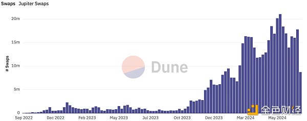 Jupiter 為交易用戶提供了多種產品,比如限價單、DCA 定投以及衍生品交易等多種服務,從而能夠滿足用戶不同的各種使用需求。在這方面上,Jupiter 可以說是盡最大可能的幫助客戶解決在交易中遇到的各種問題,不僅僅是流動性聚合器的單項產品角度出發,而是用金融的發展角度為用戶提供了全方位的金融服務,不僅能夠滿足用戶的各種金融需求,也能為交易用戶在各種不同的市場階段來提供最合適的金融服務。