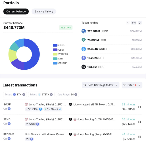 據Spot On Chain報道,Jump Trading最近從Lido Finance提取了價值2900萬美元的11,500ETH。此后,這些Tokens被轉移至CEX,通常這一舉動被市場視為出售信號。此外,該公司還申請回購超過14,000枚ETH,總價值超過4800萬美元。如果回購成功,這將使得此次潛在出售的總價值接近8000萬美元。