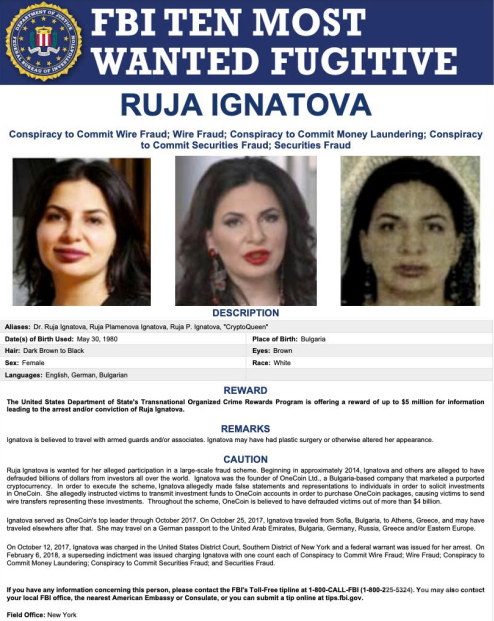 OneCoin 是一個從2014年開始運營的crypto項目,聲稱提供高額回報,但實質上卻是一個龐氏騙局。據悉,該騙局涉及的金額高達40億美元。2017年,OneCoin 崩潰后,創始人 Ruja Ignatova 失蹤。Ignatova 的最后一次公開露面是在希臘雅典,此后她的行蹤一直不明,這導致美國聯邦調查局(FBI)將她列為十大通緝犯之一。