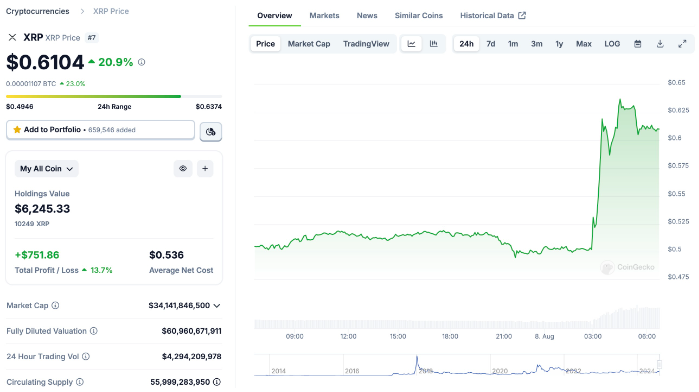 裁決結(jié)果公布后,XRP 的價(jià)格出現(xiàn)了顯著上漲。XRP 價(jià)格在24小時(shí)內(nèi)上漲超過(guò)20%,目前交易價(jià)格為0.6104美元。