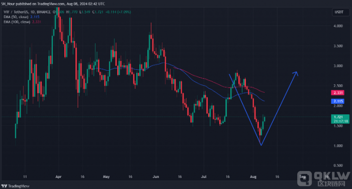 根據(jù) TradingView 的數(shù)據(jù)顯示,WIF 從8月5日的1.07美元低點上漲了66%。在8月7日的交易中,WIF 價格達到了1.77美元的盤中高點。這一價格反彈引起了市場的廣泛關(guān)注。