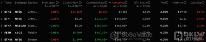 數(shù)據(jù)顯示,目前在九種Ethereum現(xiàn)貨ETF中,ETHE、ETH和ETHW分別位列管理資產(chǎn)規(guī)模的第一、第二和第五位,管理資產(chǎn)總規(guī)模達(dá)到56億美元。其中,ETHE的管理資產(chǎn)為45億美元,ETH為8.43億美元,ETHW為2.08億美元。