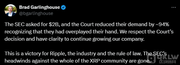 早在2023年7月,美國紐約南區地方法院認定Ripple面向機構銷售XRP資產的行為違反了聯邦證券法,并要求后者向其支付近20億美元的罰款,其中包含10億美元非法所得+預判決利息以及9億美元的民事罰款。但是,8月7日該法院法官Analisa Torres在最終的處罰文件中將最終的罰款金額修改為1.25億美元,較最初的罰款金額下調了95%左右。