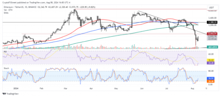 技術(shù)指標(biāo)顯示ETH可能正在形成看漲反轉(zhuǎn)。相對(duì)強(qiáng)弱指數(shù)(RSI)已經(jīng)從超賣區(qū)域回升,并準(zhǔn)備突破移動(dòng)平均線,通常預(yù)示著看漲勢(shì)頭。隨機(jī)震蕩指標(biāo)也顯示出看漲跡象,8月7日形成了看漲背離,即在價(jià)格創(chuàng)出更高低點(diǎn)的同時(shí),ETH價(jià)格創(chuàng)出更低低點(diǎn)。