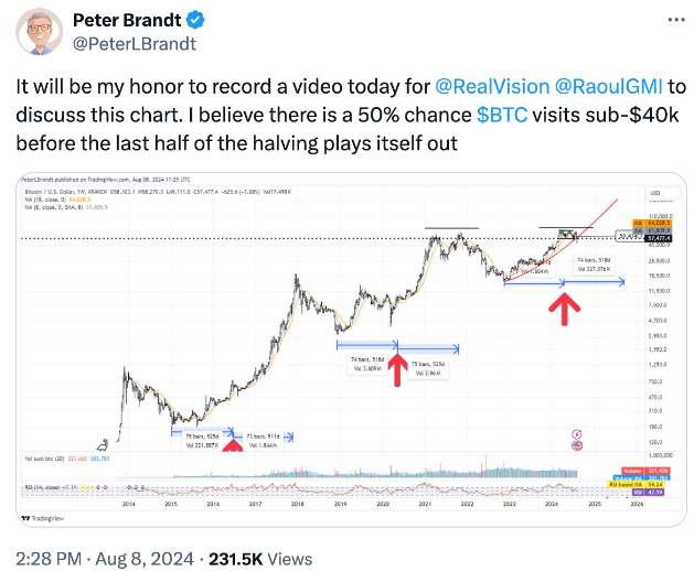 盡管有樂觀的預期,但并非所有分析師都看好Bitcoin的前景。分析師Peter Brandt在同日的帖子中表示,Bitcoin在減半后的后半段可能還有50%的機會跌至40,000美元以下。
