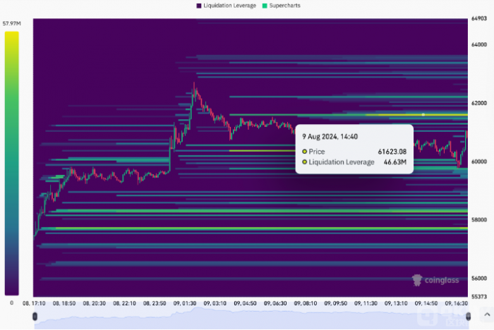 CoinGlass的數(shù)據(jù)顯示,在62,000美元附近,存在大量賣單,這進一步強化了這一阻力位的影響力。現(xiàn)貨價格與62,000美元之間的賣單接近4663萬美元,為Bitcoin的上行增加了壓力。