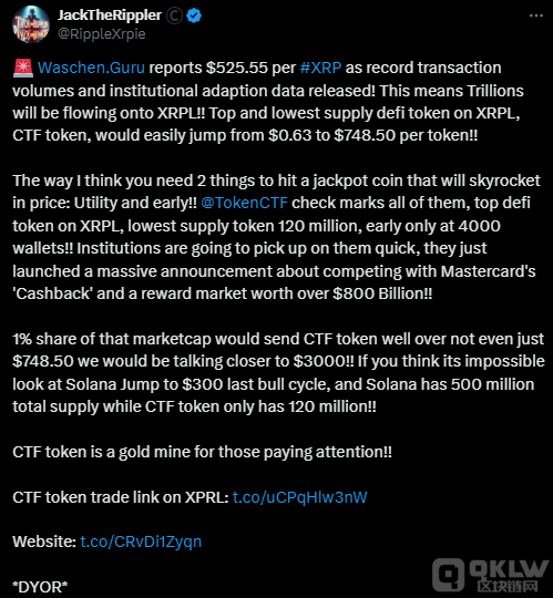 與此同時(shí),XRPL上的CTFTokens也引起了機(jī)構(gòu)的關(guān)注。由于CTFTokens的供應(yīng)量有限,僅為1.2億枚,其強(qiáng)大的實(shí)用性使得市場(chǎng)對(duì)其未來(lái)的增長(zhǎng)潛力充滿期待,許多人認(rèn)為其表現(xiàn)可能類(lèi)似于Solana的過(guò)往表現(xiàn)。