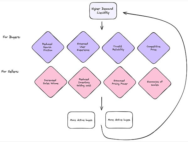 需求的復(fù)合增長(zhǎng)效應(yīng)(Compound Nature of Demand):在一個(gè)成功的Marketplace平臺(tái)上,需求的增加能夠引發(fā)進(jìn)一步的需求增長(zhǎng),形成自我強(qiáng)化的飛輪效應(yīng)。例如,Blur通過(guò)精準(zhǔn)的產(chǎn)品匹配和創(chuàng)新機(jī)制,提升了需求流動(dòng)性,并推動(dòng)了市場(chǎng)份額的增長(zhǎng)。