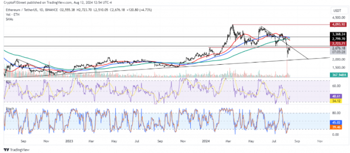 在技術(shù)層面,ETH正試圖突破2723美元的阻力位,但上周兩次未能成功突破。相對強弱指數(shù)(RSI)處于41以上,顯示出潛在的看漲動能。隨機震蕩指標(biāo)(Stoch)也顯示出買方勢頭增強。