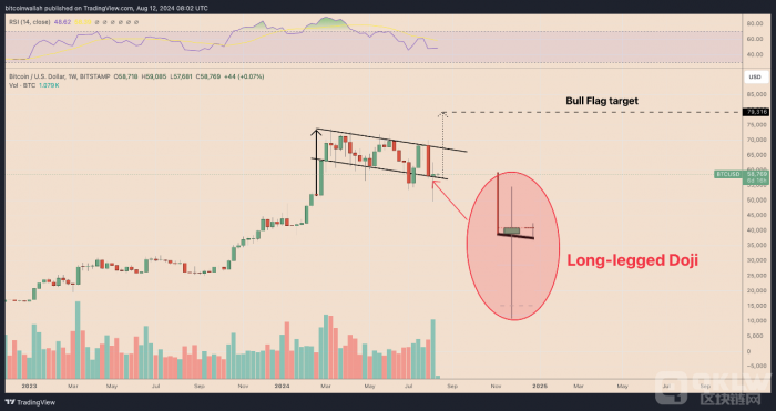 從技術(shù)面來看,在Bitcoin每周行情中,十字星蠟燭圖的形成,伴隨著Bitcoin在牛市旗形形態(tài)下接近趨勢線時的交易量上升,表明市場對價格反彈的信心正在增強(qiáng)。這可能預(yù)示著到9月份,Bitcoin將有機(jī)會反彈至旗形的上趨勢線,大約在66,500美元左右。