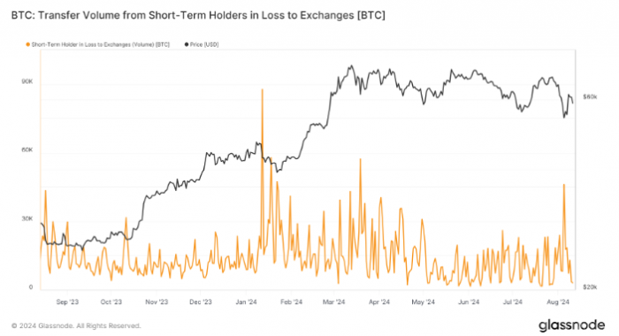 數據顯示,短期持有者持有的Bitcoin中,虧損的數量相較于8月5日的280萬枚有所下降。當時,Bitcoin價格一度跌至49,000美元,造成了不少投資者的資金損失。當前的損失水平與2022年11月FTX崩潰后類似,顯示出市場的脆弱性。