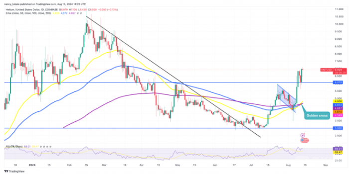 HNT的上漲與美國兩家主要運營商測試將流量轉(zhuǎn)移到Helium網(wǎng)絡的消息密切相關(guān),這一進展可能促進網(wǎng)絡的Decentralization。技術(shù)上,HNT形成了“金十字”,RSI值為68,表明看漲勢頭仍在持續(xù),價格有望接近2024年3月的9.60美元高點。