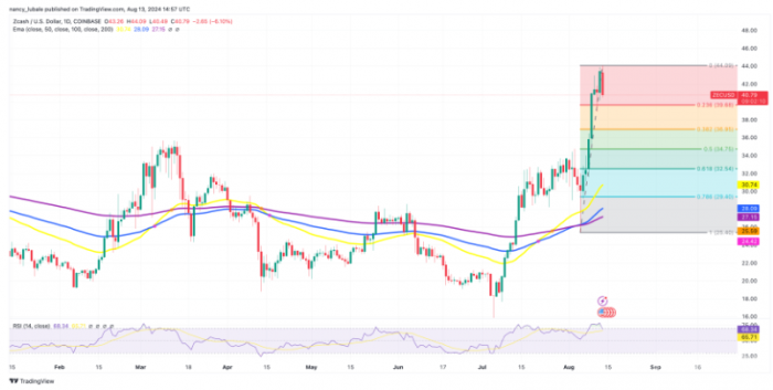 Wilcox在8月10日的博客中提到,Zcash需要從工作量證明(PoW)機制切換到PoS,以提高其隱私和安全性。盡管當前價格接近44美元的強阻力位,ZEC的RSI值已高于70,顯示出超買狀態(tài),可能面臨回調(diào)風險。