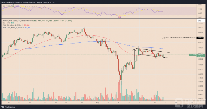 當(dāng)前,Bitcoin的橫盤整理趨勢表現(xiàn)出牛市旗形的特征,通常在強(qiáng)勁上行后形成。根據(jù)技術(shù)分析,如果Bitcoin突破其上趨勢線,目標(biāo)價(jià)格可能達(dá)到65,960美元。