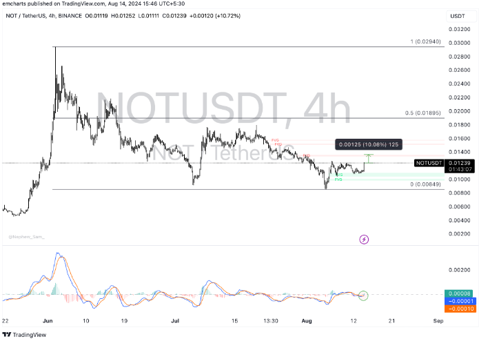 Notcoin在經(jīng)歷了數(shù)月的下行趨勢后,周三觸及0.0129美元的局部高點(diǎn),市場分析師預(yù)測其目標(biāo)價(jià)為0.01362美元,漲幅約為10%。根據(jù)移動(dòng)平均收斂背離(MACD)指標(biāo)的分析,MACD線已穿過信號(hào)線,這被視為看漲信號(hào),可能驅(qū)動(dòng)NOT價(jià)格進(jìn)一步上漲。