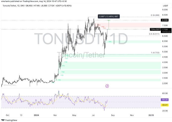在持續(xù)看漲的情況下,Toncoin可能會(huì)在6,083美元的公允價(jià)值缺口區(qū)域找到支撐,當(dāng)前相對強(qiáng)弱指數(shù)(RSI)為58.2。
