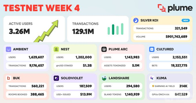 根據Plume在8月13日發布的推特數據,該項目在測試網上線一個月后,已經吸引了326萬用戶登錄測試主網,共產生了1.29億次交互。其中,白銀認證級別的KOL帶來了321,549次交互,總價值達9億美元。