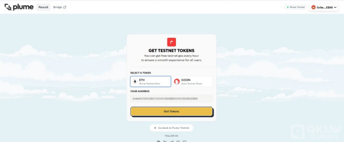 用戶可以通過Plume的官方水龍頭獲取ETH和GOON。訪問Plume測試網頁面后,連接錢包,然后添加Plume測試網絡。檢查資格并鑄造一個Plume Goon NFT。ETH用于支付gas費用,從EthereumSepolia上的ETH橋接到Plume上。請注意,這些都是測試網Tokens,沒有任何貨幣價值。