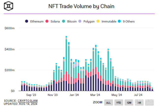 盡管Animoca長(zhǎng)時(shí)間以來(lái)一直看好NFT市場(chǎng),但整個(gè)行業(yè)仍在努力恢復(fù)到2021年和2022年的高峰水平。根據(jù)Cryptoslam的數(shù)據(jù),NFT的總交易量在2021年達(dá)到32.4億美元,而最近一周僅錄得8000萬(wàn)美元。