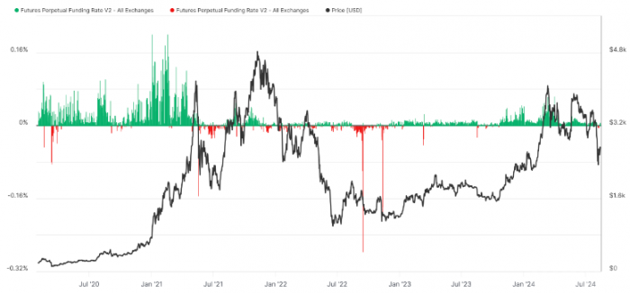 獨立交易員John Morgan也表示,當前資金費率和ETH價格下跌的趨勢表明市場情緒正在轉向看跌。Glassnode的數(shù)據(jù)顯示,自2024年初以來,ETH的資金費率總體偏正,但最近價格跌至2100美元時,資金費率下降,這表明市場心理發(fā)生了變化。