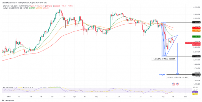 從TradingView的數(shù)據(jù)來看,自7月29日高點3400美元以來,ETH價格已下跌35.5%,至8月5日的低點2116美元,之后略有回升至2552美元。日線圖上顯示熊旗形態(tài),暗示下跌趨勢可能持續(xù)。