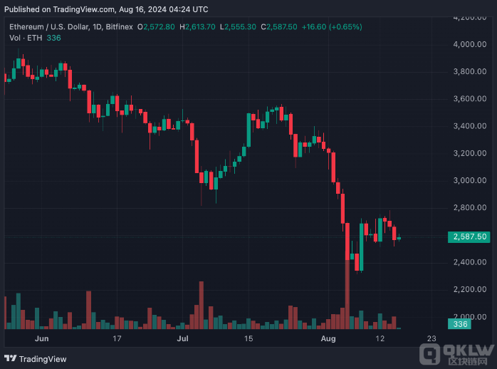 在市場(chǎng)整體看跌的背景下,Ethereum價(jià)格也出現(xiàn)了短期波動(dòng)。截至目前,ETH 交易價(jià)格為2587美元,較前一天下跌3.5%,交易量降至160億美元。這一價(jià)格回落可能會(huì)進(jìn)一步影響Ethereum的吞吐量。
