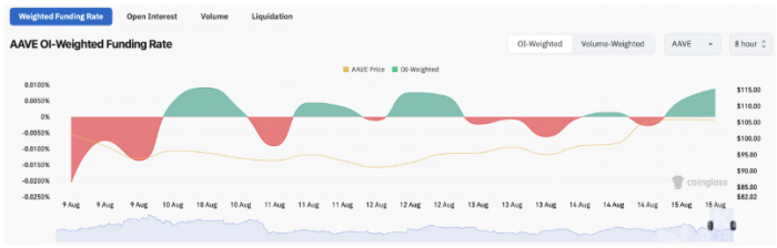 Aave的Tokens期貨融資利率也發生了顯著變化,從負值轉為正值。根據Coinglass的數據,未平倉合約的資金費率目前為0.0087%,較一周前的-0.0136%有明顯改善。正的資金費率表明市場對Aave的未來表現持樂觀態度,多頭頭寸增加。