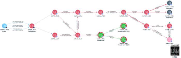 他在調查某個項目被黑事件時,發現了復雜而熟練的資金流動軌跡,包括專用的盜竊地址、混幣器以及兩家交易所的洗錢操作。