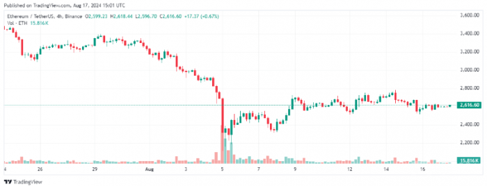 截至本文撰寫時,ETH在過去24小時內(nèi)上漲了1.2%,價格達(dá)到了2,616美元。