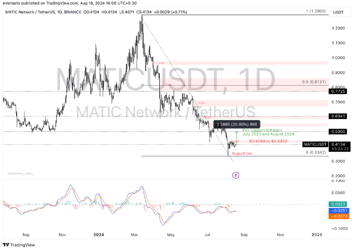 在MATICTokens遷移的背景下,市場(chǎng)對(duì)其價(jià)格走勢(shì)充滿期待。經(jīng)過一段時(shí)間的看跌行情后,MATIC在2024年7月成功脫離了低迷期。目前,MATIC的交易價(jià)格約為0.41美元。分析師預(yù)測(cè),價(jià)格有望上漲20.9%,達(dá)到0.50美元。這一價(jià)格水平將成為MATIC的關(guān)鍵支撐位。