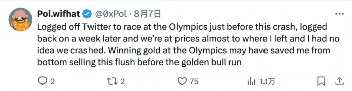 之后在 8 月 7 日,Pol.wifhat 再次發文表示:“在奧運會比賽期間我暫時退出了 X,剛好躲過了這次市場暴跌,一個星期后當我重新上線時,發現幣價幾乎已回到了我離開時的位置,我甚至沒意識到市場曾經崩盤了。看來去拿一枚奧運金牌有助于避免在牛市來臨之前恐慌拋售。”
