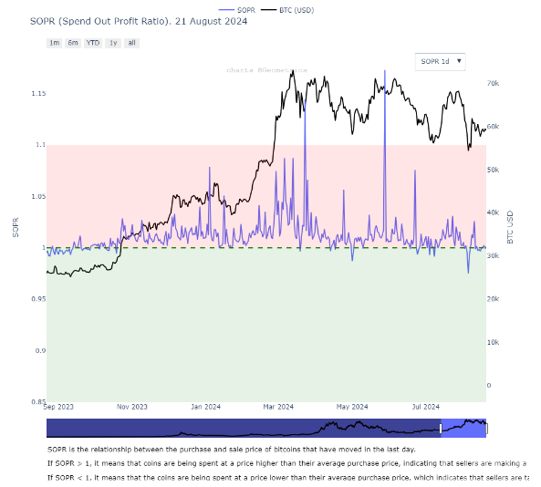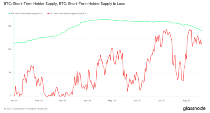 盡管數(shù)據(jù)顯示,80%的短期持有者(STH)面臨虧損,實(shí)際損失卻相對較小。這表明Bitcoin持有者的信心仍在。通過對短期持有者供應(yīng)和支出產(chǎn)出利潤率(SOPR)的分析,能更好地理解Bitcoin的市場情緒。數(shù)據(jù)顯示,7月28日至8月20日期間,短期持有者虧損比例從21.74%飆升至94.21%,隨后略有回落。