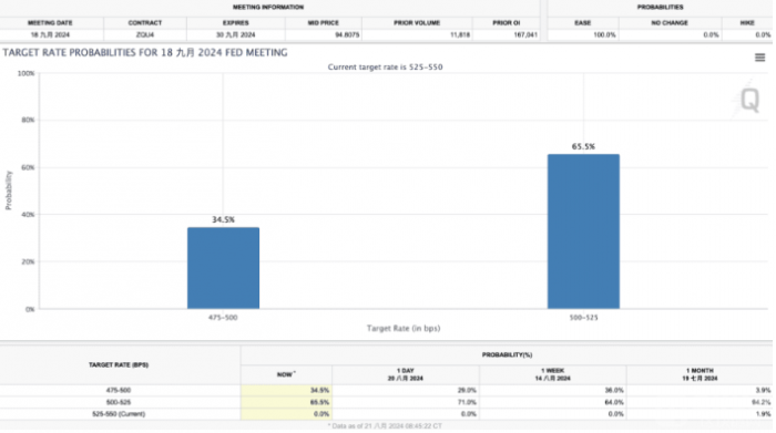 根據(jù)芝加哥商業(yè)交易所(CME)FedWatch的數(shù)據(jù),截至22日上午,市場參與者預(yù)計(jì)聯(lián)邦基金利率將在9月18日降息一碼至5.00%~5.25%的概率約為65.5%,而降息兩碼至4.75%~5.00%的概率上升至34.5%。換句話說,交易者對9月降息一或兩碼的預(yù)期已達(dá)100%。