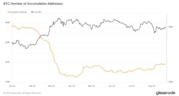從5月份開始,這些累積地址的數量開始小幅回升,到了8月份,數量穩定在82.2萬個左右。這一小幅回升反映出長期持有者在減半后對市場波動的謹慎態度,盡管市場仍存在不確定性。
