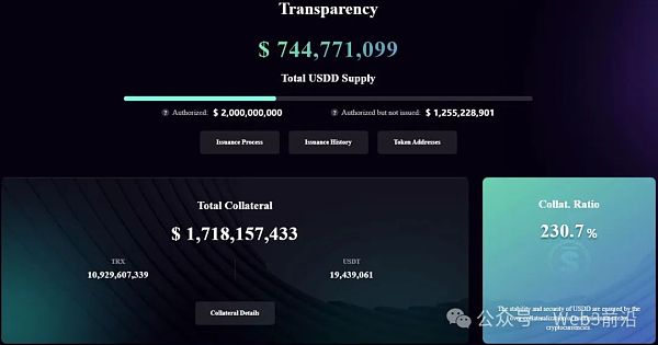 USDD的透明度頁面目前顯示超過7.44億美元的流通量。該穩定幣的透明度頁面列出了其儲備中價值17億美元的TRX和USDT,其抵押率超過230%。