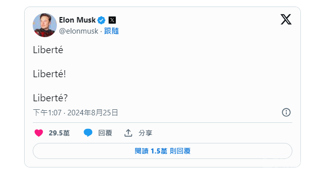 特斯拉創辦人 埃隆.馬斯克(Elon Musk) 也在 X 平臺上通過法語發聲,呼吁「自由」并強調言論自由的重要性。