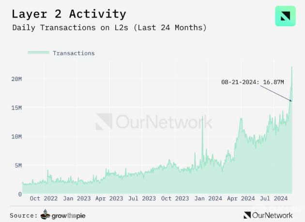 據(jù)OurNetwork報道,EthereumLayer 2解決方案的交易量正在前所未有地增長,8月21日的日交易量達到創(chuàng)紀錄的1687萬筆。