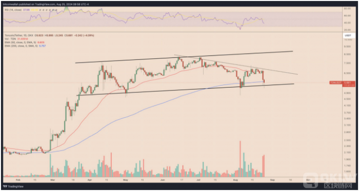 從技術(shù)角度來看,TON仍在一個明確定義的上升通道內(nèi)交易。8月25日,TON的相對強(qiáng)弱指數(shù)(RSI)為37.54,接近超賣區(qū)域,這通常預(yù)示著價格可能會出現(xiàn)反彈。上升通道的上方趨勢線約為8.50美元,若價格能回升至這一水平,將表明約50%的上漲潛力。