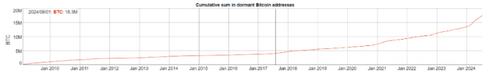 這一現(xiàn)象引發(fā)了市場的熱烈猜測,特別是在多個休眠錢包被重新激活、數(shù)百萬美元的Bitcoin被轉移的背景下。根據(jù)BitInfoCharts的數(shù)據(jù),不活躍錢包中的Bitcoin數(shù)量自2024年1月的740萬枚增加到現(xiàn)在的1830萬枚。